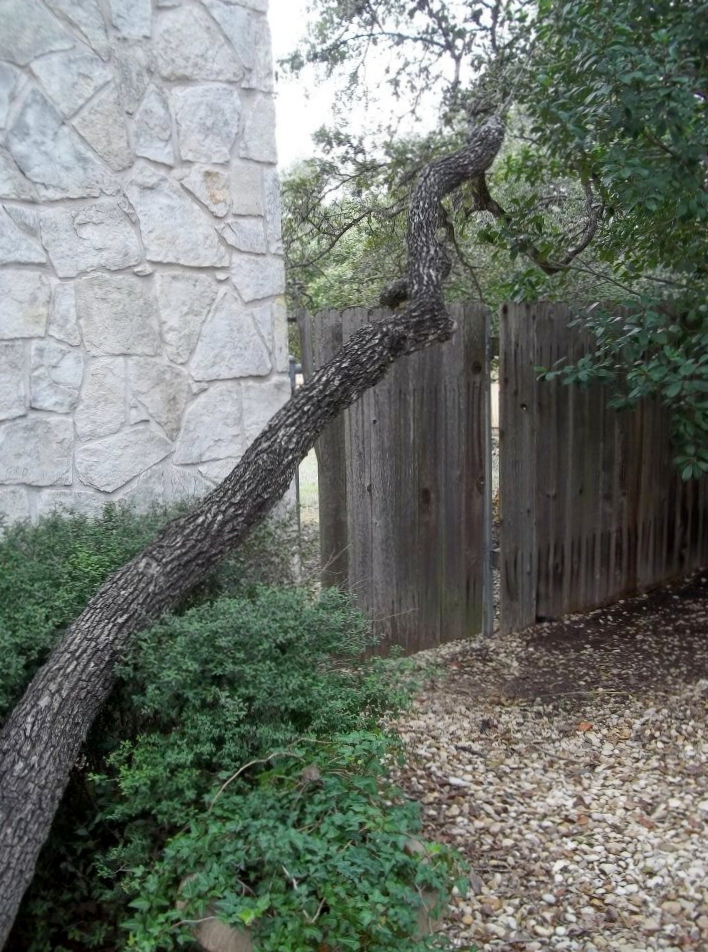 There was a notch in the old gate for this tree limb which is headed for daylight around the corner of the house. It is not deformed or falling down, that's just what live oaks do, growing horizontally as needed.