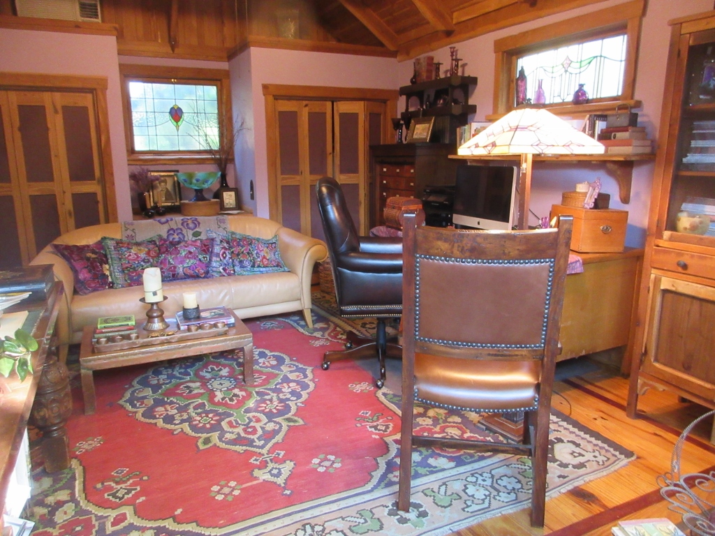 Lucinda's office at the back of her garden is outfitted with more subdued colors and filled with mementos and books.